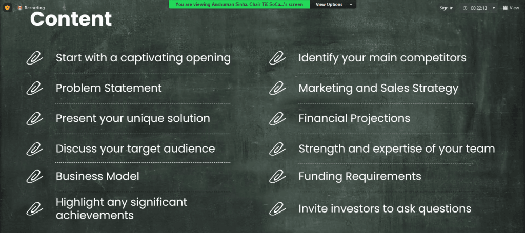 “We’ll have pitching sessions every second and last Friday of every month. You should raise your hand to start practicing your elevator pitch. There’ll be a clock ticking in front of your screen to help you know how much time you’re taking to complete your pitch. You’ll get two minutes to finish your elevator pitch. Once you complete your pitch, we’ll take a look at it and give our crucial feedback on the same,” says Anshuman Sinha.